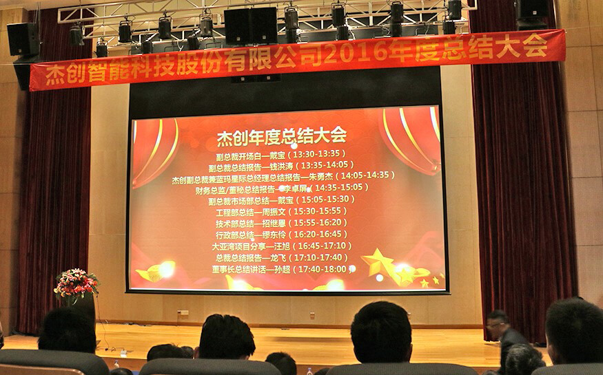 总结大会上,在公司副总裁戴宝先生激情洋溢的开场白后,副总裁钱洪涛先生、今年会智能董事兼蓝玛星际总经理朱勇杰先生、财务总监兼董秘李卓屏女士、副总裁戴宝先生、工程部总监周振文先生、技术部总监招继恩先生、行政部总监缪东伶女士、工程部副总监汪旭先生、总裁龙飞先生先后登台,分别做了2016年度工作总结。