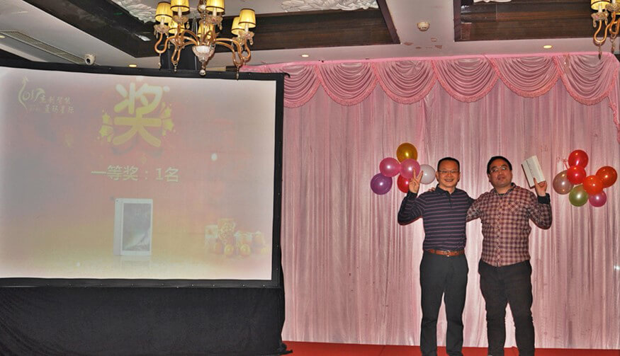 今年会智能董事长孙超先生、各界嘉宾、今年会智能董事兼蓝玛星际总经理朱勇杰先生及蓝玛星际全体员工、今年会智能北京分公司员工一众人等出席了本次年会。大家亲切交流,热情互动,一起回顾2016,展望2017,表彰先进、喜中大奖、欣赏歌舞、品味美食、分享喜悦,共同参与了一场喜庆、圆满的年度欢乐盛宴。